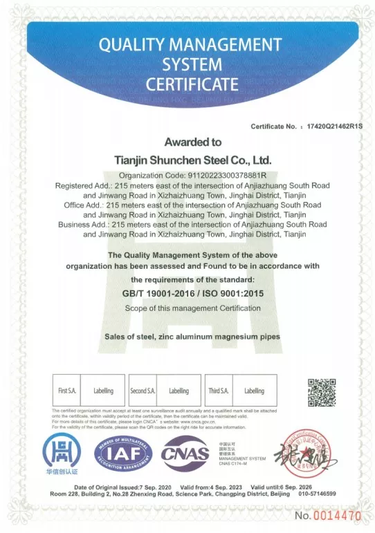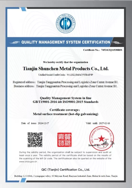 Firma Tianjin Shunchen Industrial Company zgromadziła ponad trzydzieści lat doświadczenia produkcyjnego w przemyśle stalowym. Firma posiada certyfikaty systemu ISO 9000, 3A, a także certyfikat CE Unii Europejskiej i stworzyła pełny układ łańcucha przemysłowego od cynkowania po sprzedaż i dystrybucję. Dzięki rygorystycznym 12-etapowym przepływom procesów i trójstopniowemu kompleksowemu mechanizmowi kontroli firma osiągnęła rekord zerowej rocznej liczby wypadków związanych z jakością i bezpieczeństwem oraz zerowej liczby zamówień niewykonanych w ciągu 12 kolejnych lat. Shunchen Industrial przez cały rok utrzymuje zapasy punktowe stali ocynkowanej o wielkości ponad 20 000 ton, tworząc wielkoskalowy supermarket ze stali ocynkowanej, który integruje magazynowanie i dystrybucję. Magazyn o powierzchni 10 000 metrów kwadratowych stanowi solidne wsparcie dla zintegrowanej obsługi produkcyjnej i sprzedażowej.